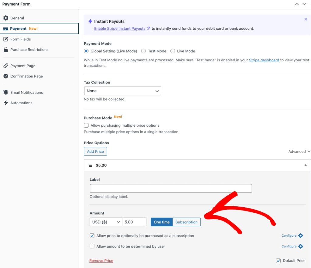 Once you’re in the form builder, you can add your donation price options, toggle on one time and check the box to allow the price to optionally be purchased as a subscription.