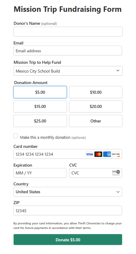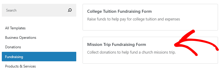 For the sake of this tutorial, we’re looking to create a donation form with custom amounts and different trip options. Go ahead and click on Mission Trip Fundraising Form.