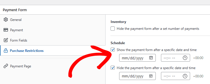 If you want to schedule when your form starts and stops accepting donation payments, all you need to do is navigate to the Purchase Restrictions option on the left and enter your desired dates and times.