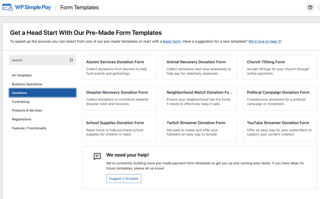 WP Simple Pay offers several pre-built donation payment forms to help you create a form in minutes with little effort. We’ll be using the Mission Trip Fundraising form. We’ll also see different customization options for advanced use cases.