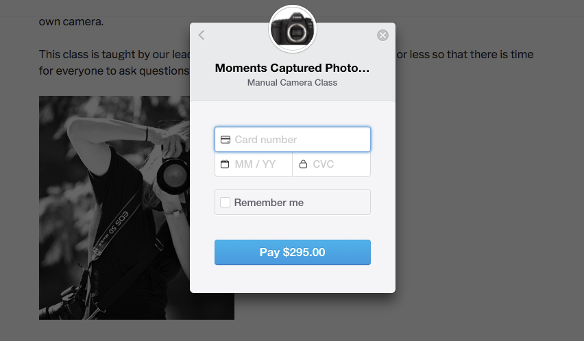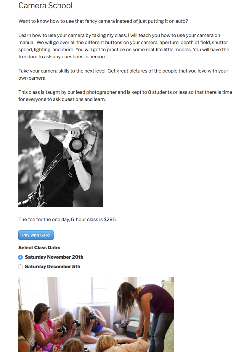 Here’s an example below. This photography studio teaches a one-day camera class and charges a one-time fee of $295. A simple payment form was added to a page on the studio’s site.