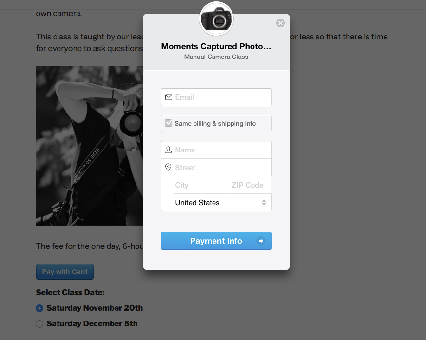 Creating this payment form makes accepting payments for a photography class simple and straightfoward.