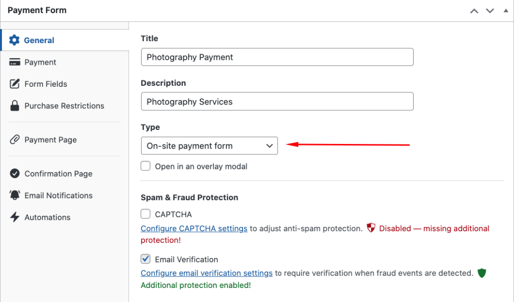 For the purpose of this tutorial, leave your form Type set to On-site. This will allow you to embed your payment form on any page or post on your site.