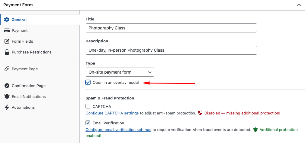 Next, in the General tab, be sure to add the title and description of your form. If you want your form to display similarly to the example, check the box for Open in an overlay modal for the form Type.