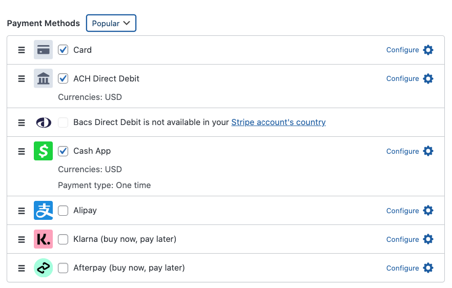 To help increase conversions, it’s a smart idea to offer several different payment method options. Go ahead and choose the ones you want to offer from the list.
