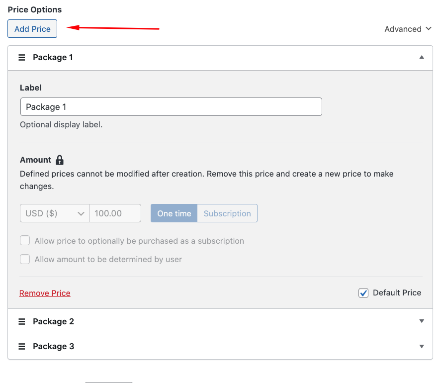 Next, you can add your pricing options and amounts in the Payment tab. For example, by clicking the Add Price button, you can create different options for your services.