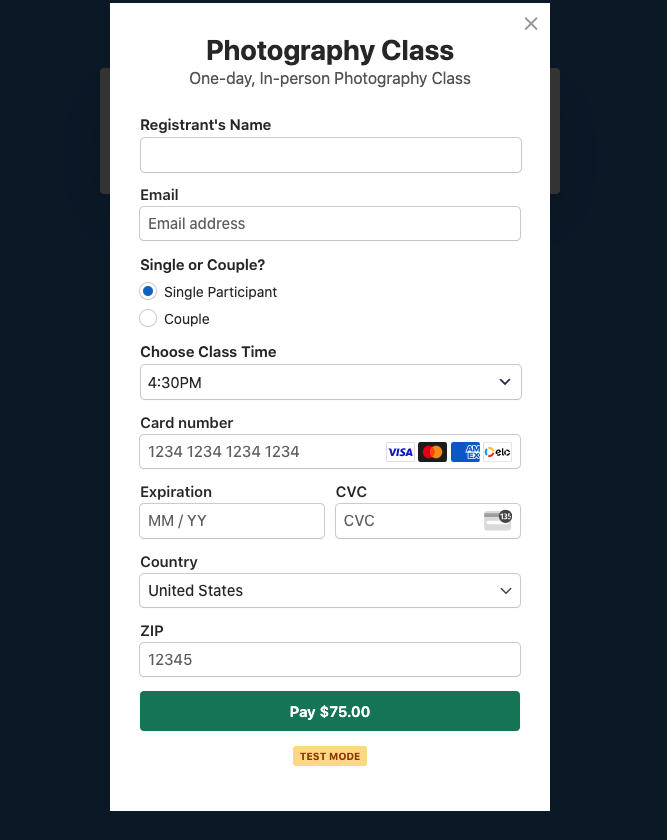 Again, if your needs are basic, you can accept payments for your classes with WP Simple Pay. The plugin makes creating a registration payment form for events super easy.