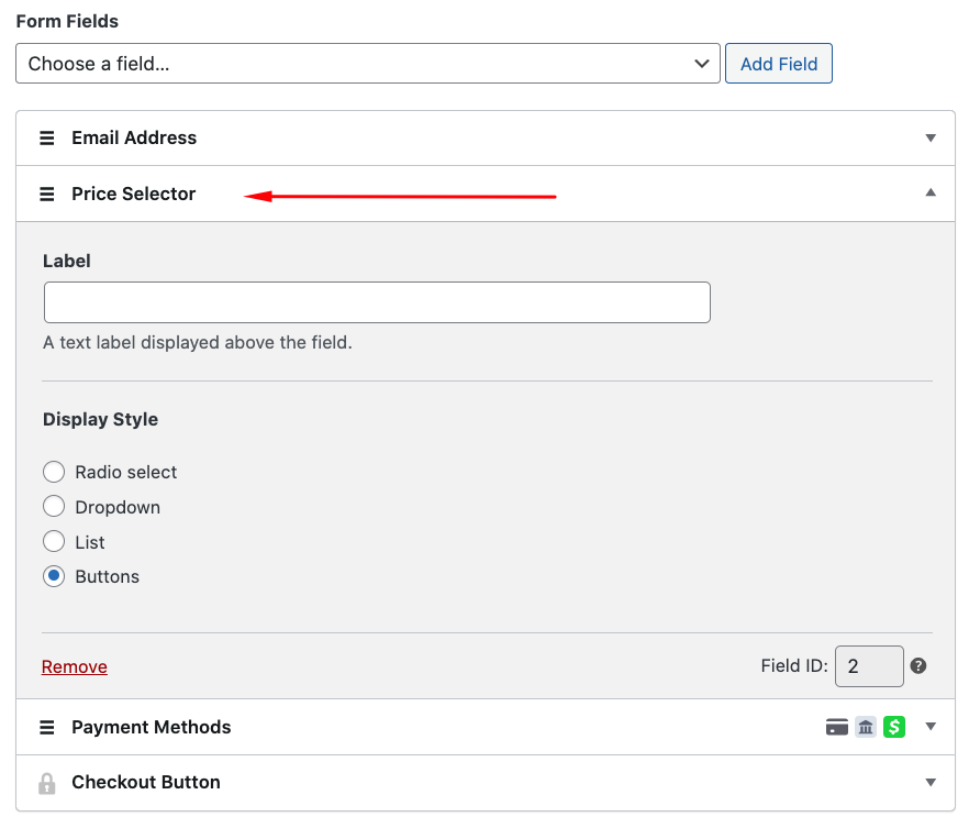 Here, you can add, edit, or remove custom fields from the dropdown menu. If you wish to display your different pricing options as a dropdown or as buttons, simply click the Price Selector option to configure it.