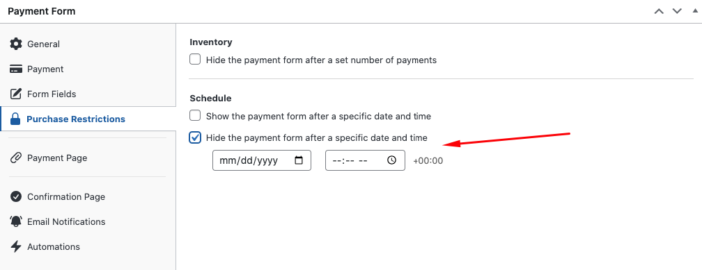 To ensure you don’t overbook or sell registrations after the event has ended, simply click on the Purchase Restrictions tab and configure your form’s schedule and maximum available spaces.