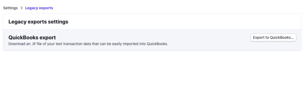 If you’re using QuickBooks, navigate to Settings → Legacy exports in your dashboard and ensure that QuickBooks is set up. You can download an .iif file compatible with the system.