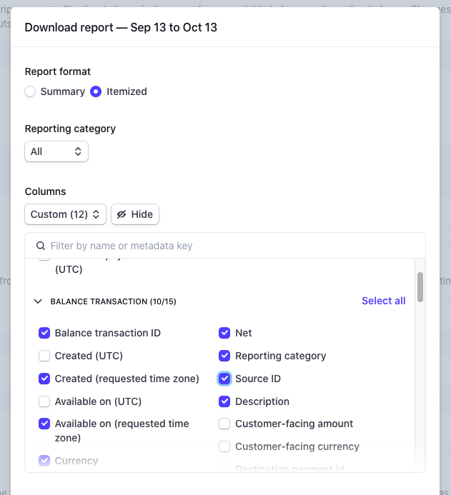 - balance_transaction_id: This column customization allows you to add a unique identifier to any transaction, for a certain type of payout.