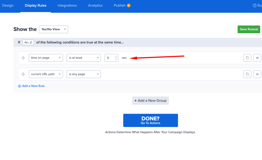 Klicken Sie zuerst im Menü auf Display Rules, um die Einstellungen für die Zeit auf der Seite und die Seiten zu ändern, auf denen das Popup erscheinen soll.
