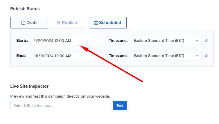 Navigieren Sie dann zur Registerkarte Veröffentlichen und klicken Sie auf die Schaltfläche Zeitplan. Stellen Sie sicher, dass Sie die Start- und Endzeiten an Ihren spezifischen Black Friday-Sale anpassen, und klicken Sie dann erneut auf Speichern.