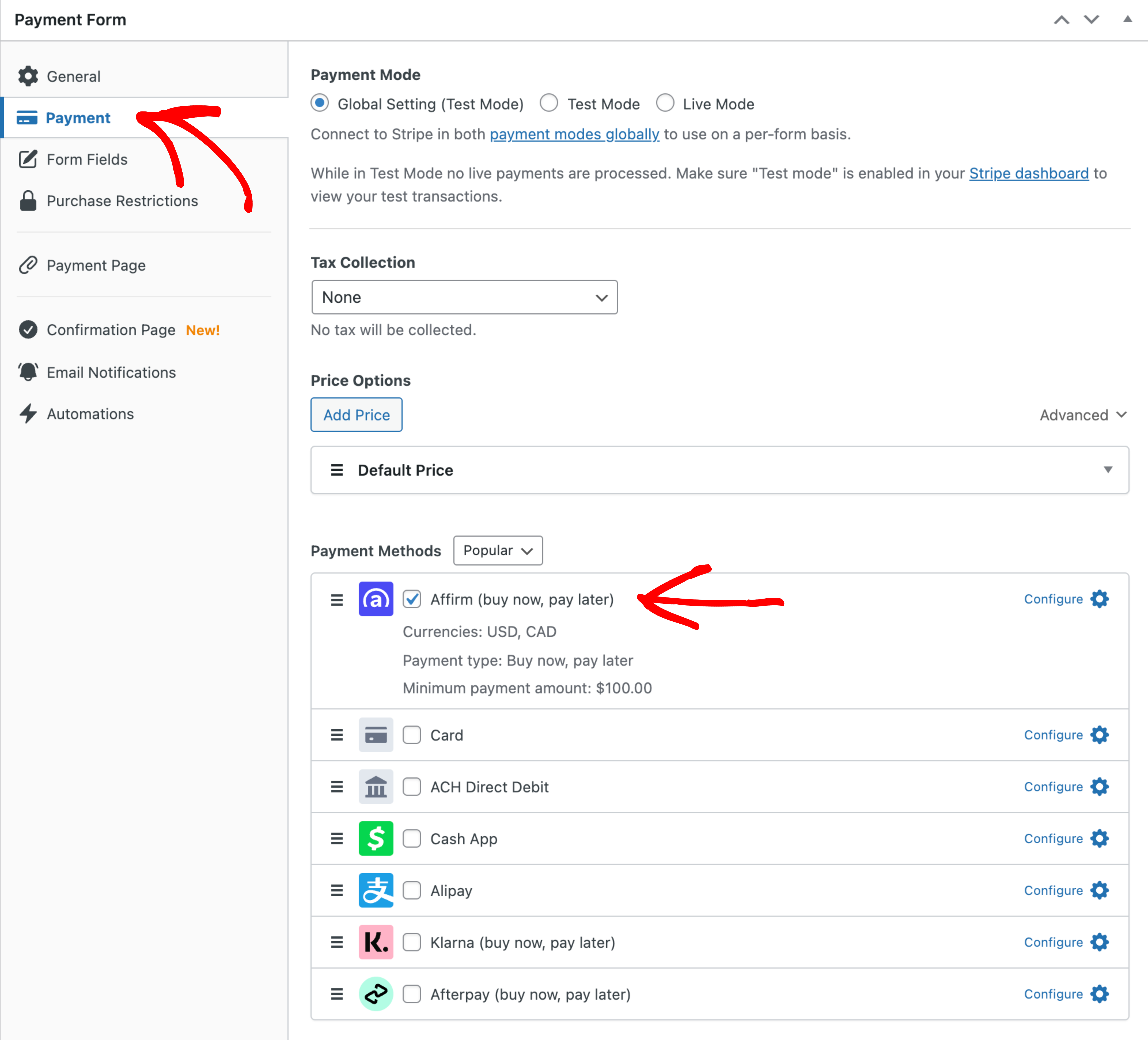 To accept Affirm payments, visit the Payment tab in the payment form builder, and enable Affirm (buy now, pay later).