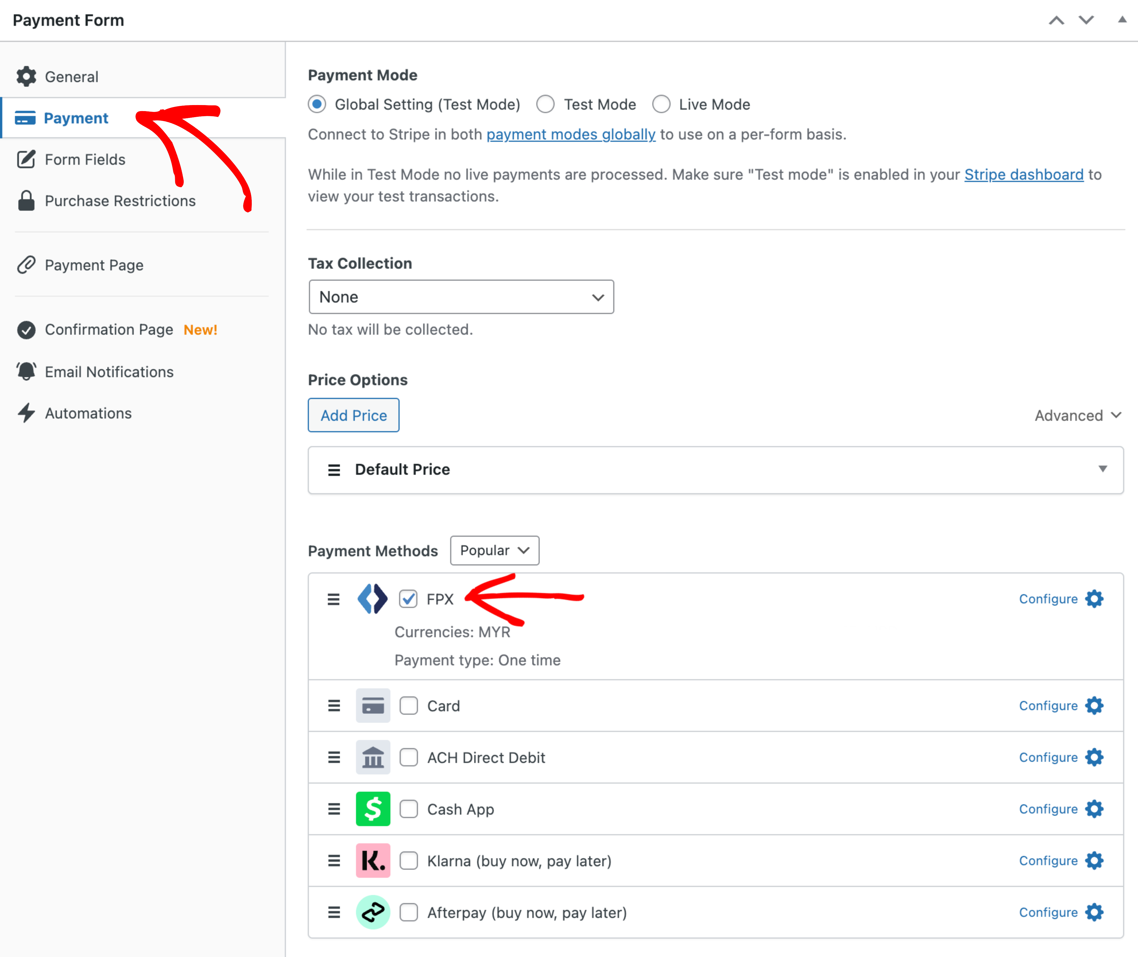 To accept FPX payments, visit the Payment tab in the payment form builder, and enable FPX.