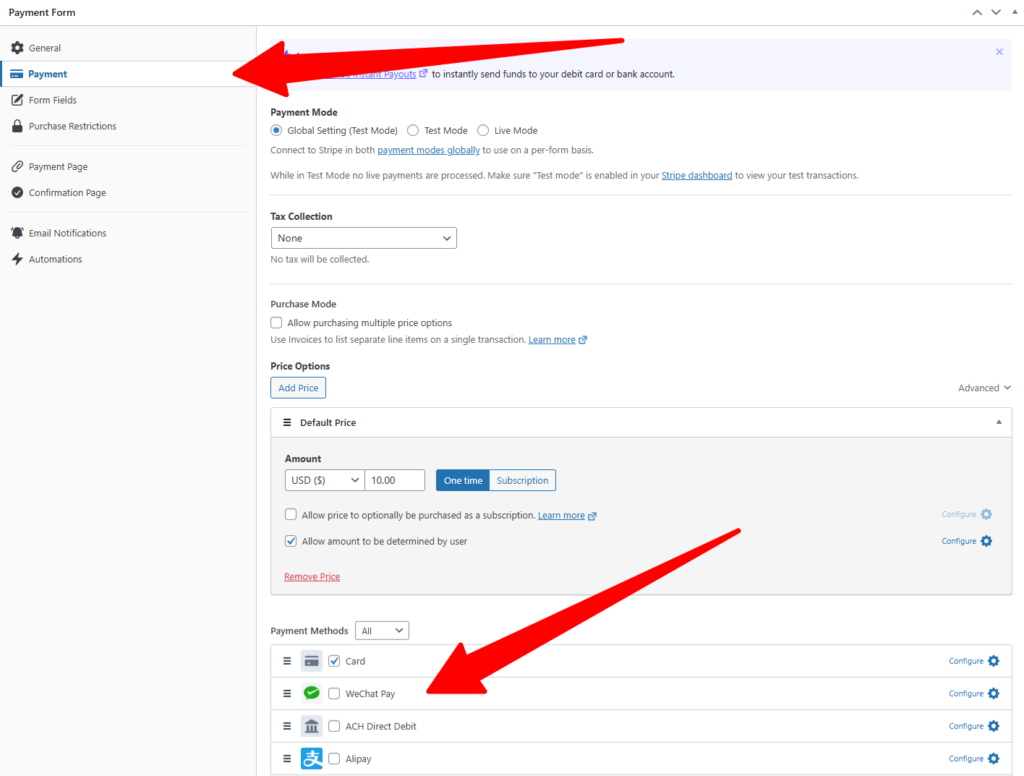 To accept WeChat Pay payments, visit the Payment tab in the payment form builder and enable WeChat Pay.