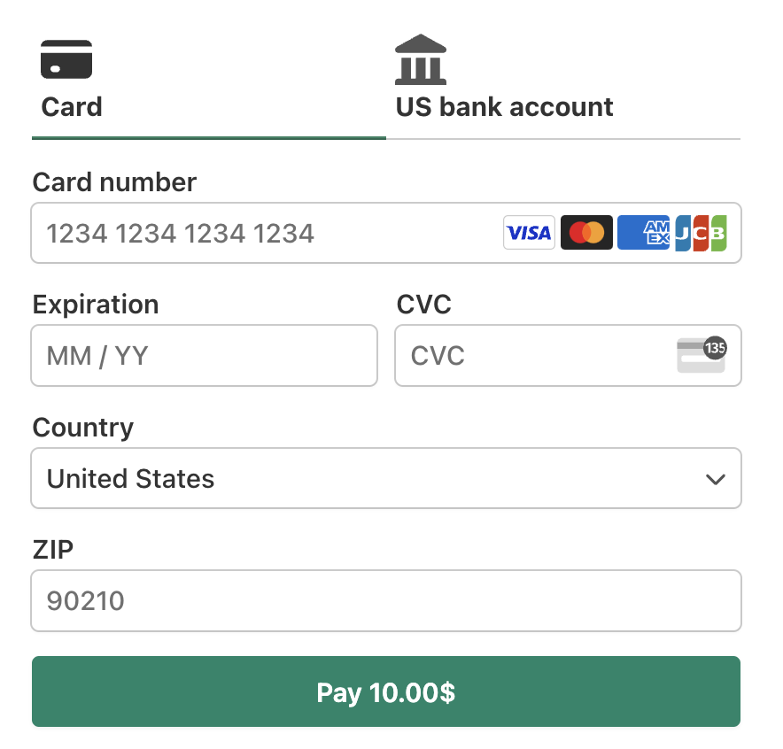 To provide the maximum level of security none of the form fields that collect sensitive payment information are loaded directly on your website. Instead, an <iframe> is embedded on the page and its contents are loaded directly from Stripe’s servers.