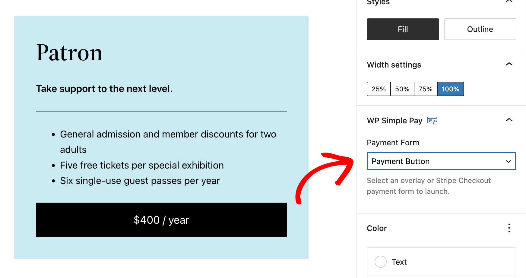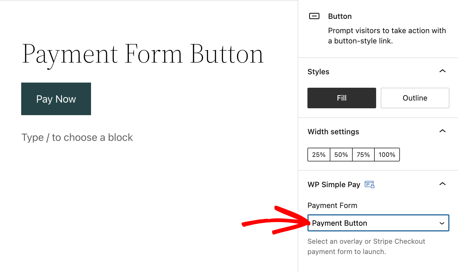 Once you have inserted and customized the Button block you can link the created payment form or payment button. In the block’s settings sidebar, select the form you would like to use in the “WP Simple Pay” panel.