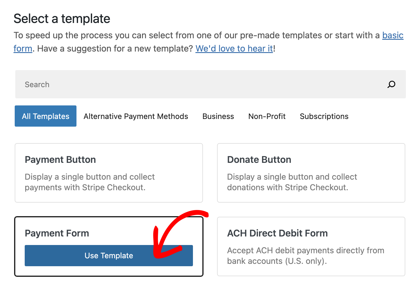 Visit WP Simple Pay → Add New and select the Payment Form payment form template.
