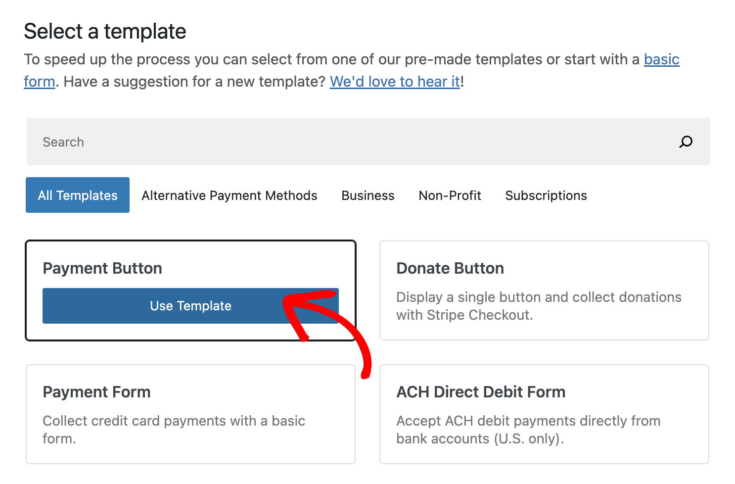 Visit WP Simple Pay → Add New and select the Payment Button payment form template.