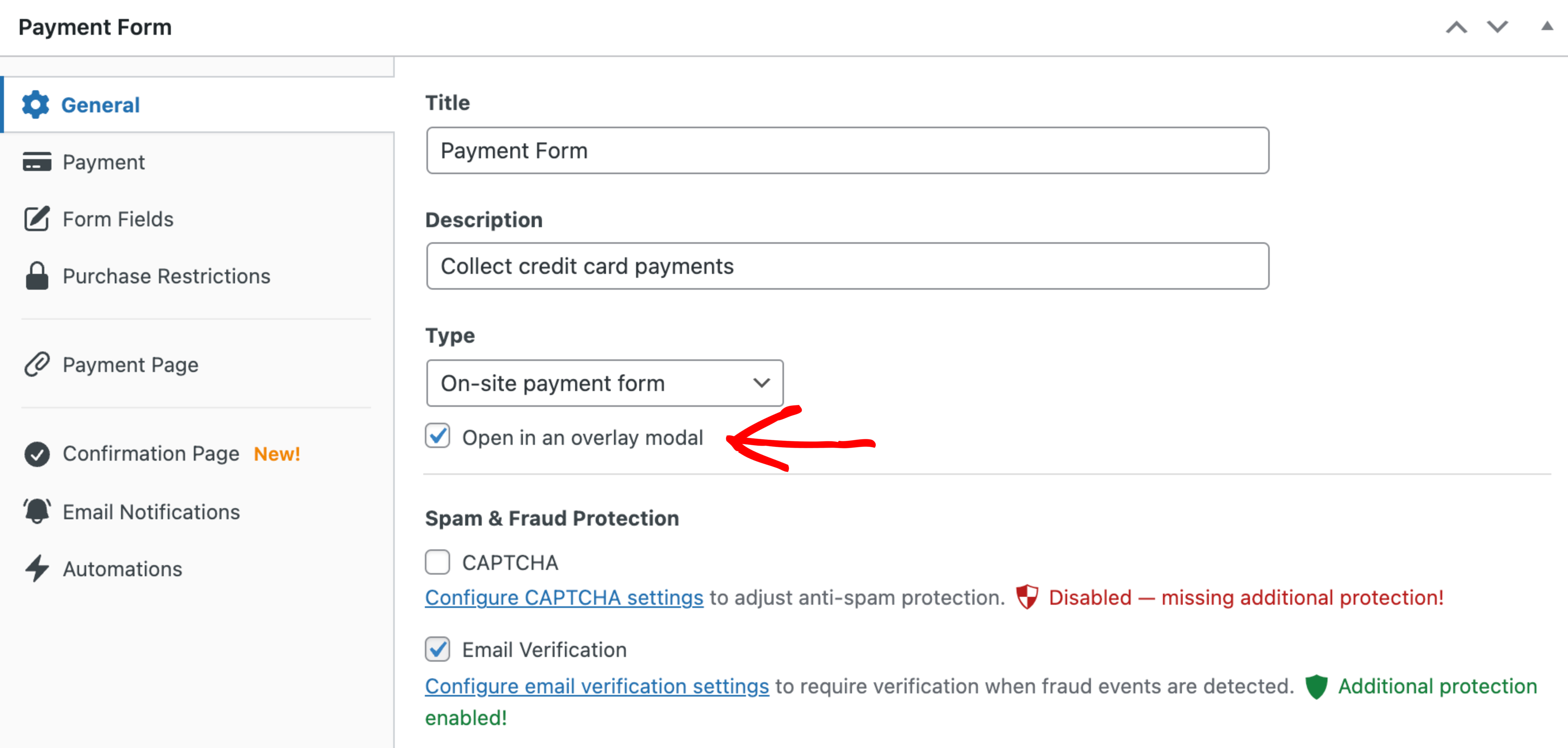 First we need to ensure we have a compatible payment form created. Due to the nature of launching the payment form from a single button, only on-site payment forms set to open in an overlay modal, or off-site Stripe Checkout forms without additional fields can be used.