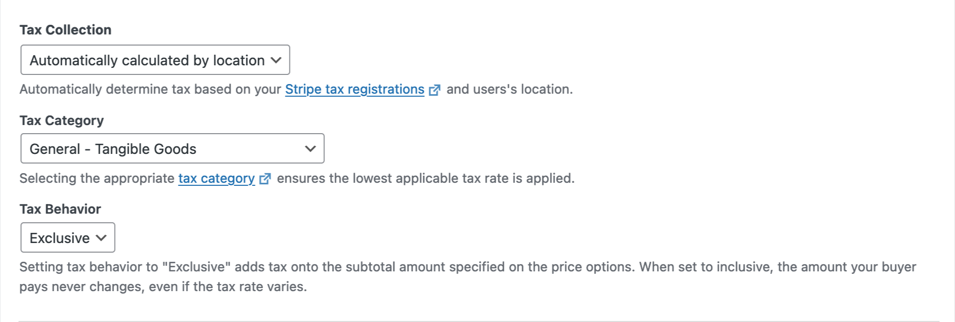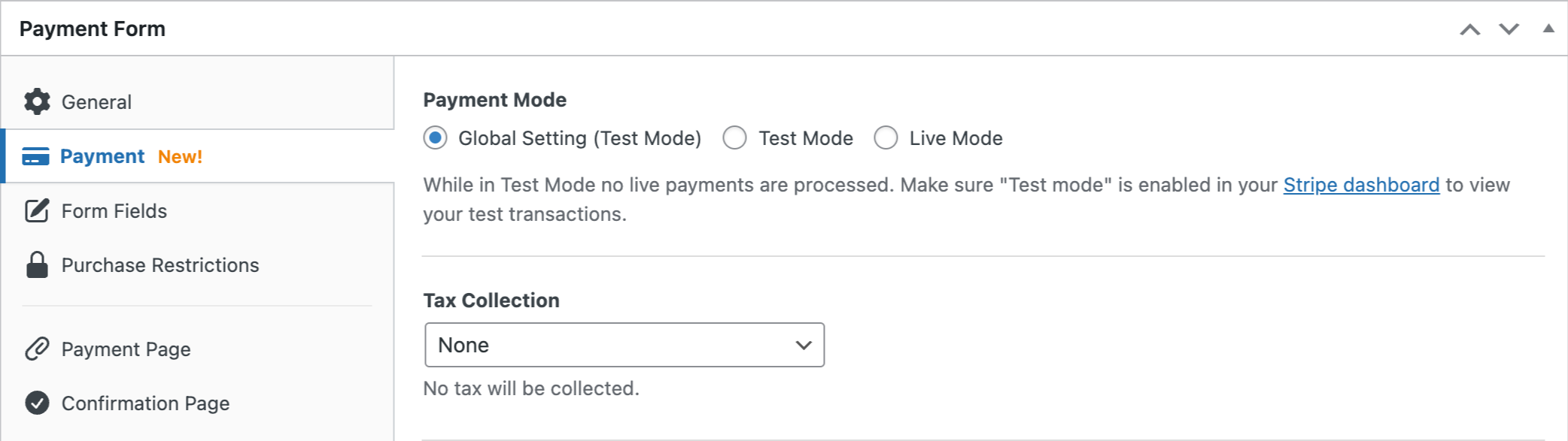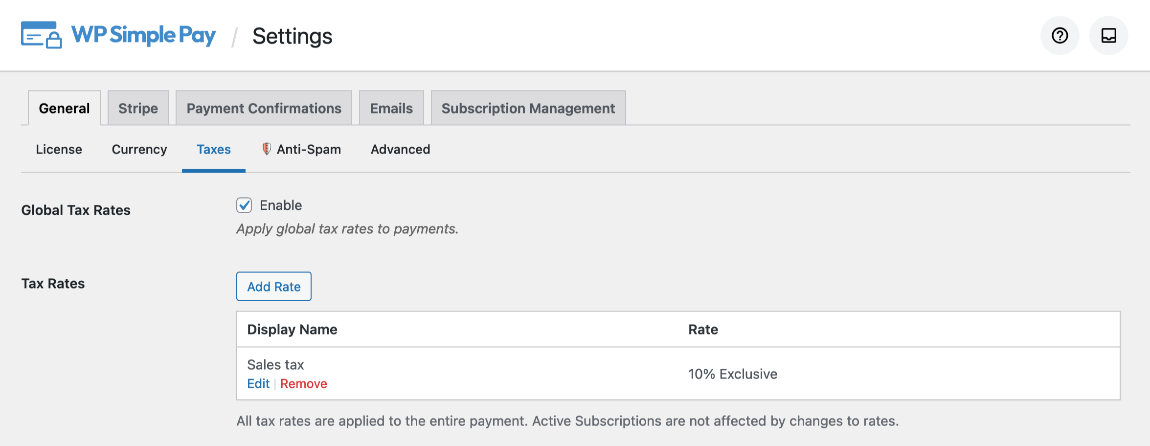 To charge fixed tax rates, select the Global Tax Rates option in the Tax Collection dropdown. Tax rates can be managed by visiting WP Simple Pay → Settings → General → Taxes.
