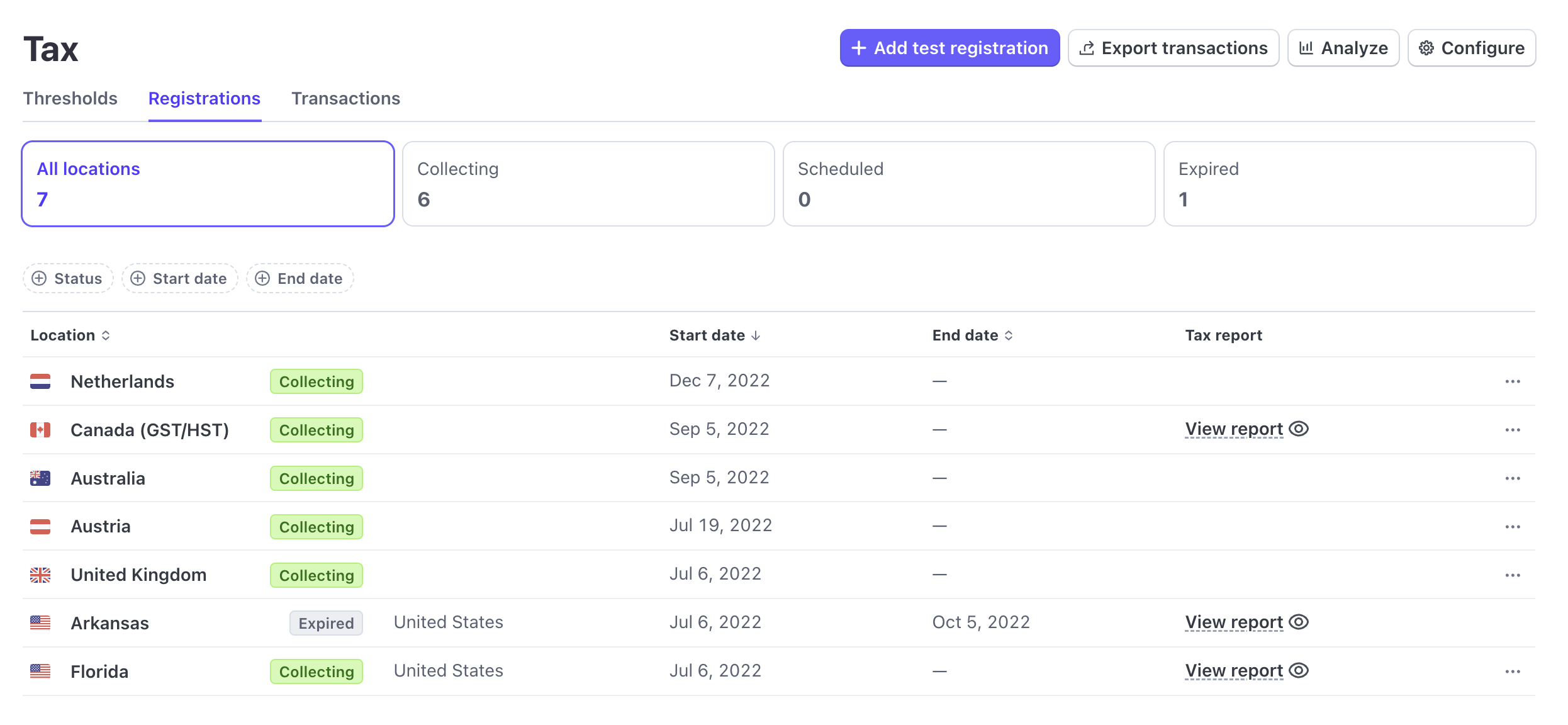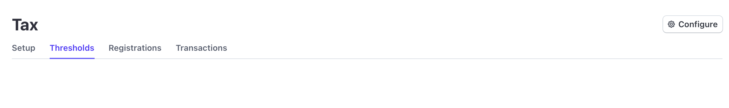 Before you can automatically calculate tax amounts, you must first activate Stripe Tax in the Stripe dashboard. You can monitor tax thresholds before adding tax registrations, as you might not need to register if your business only sells nontaxable products in a jurisdiction. After a threshold has been reached, a registration can be added to start collecting taxes for those locations.