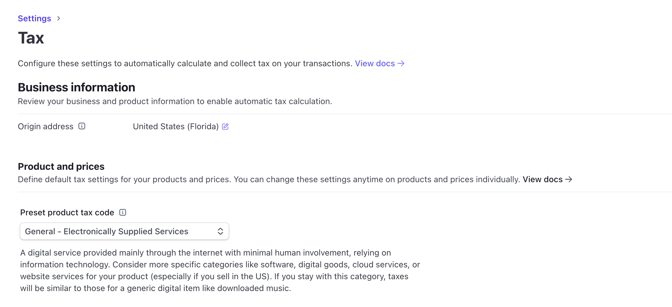 You define your business’s origin address and add tax registration jurisdictions to start collecting immediately or to schedule collection later.