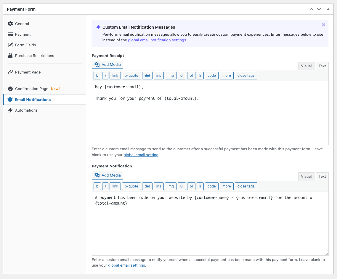 While editing a payment form, you can specify custom Email Notifications by adding a Payment Receipt message that will be sent to your customers after they make a purchase using this form and a Payment Notification message that will be sent to the site owner.