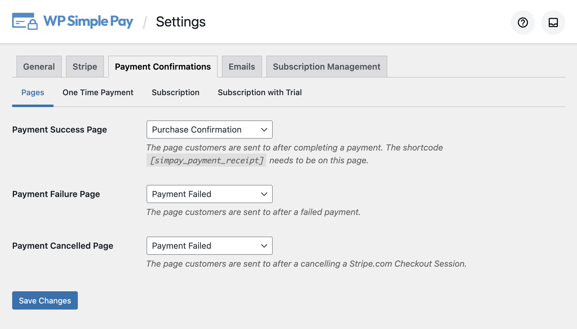 Global confirmation messages can be configured by visiting WP Simple Pay → Settings → Payment Confirmations.