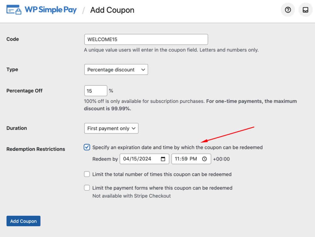 WP Simple Pay lets you create custom coupon codes and add them to specific payment forms. You can also use the plugin to set up coupon redemption restrictions. If your business sells subscription-based products or services, offering a 100% discount on new subscription activations is easy with WP Simple Pay.