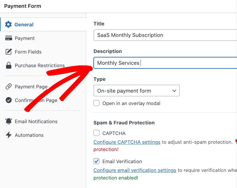 Next, you’ll see where you can add the title and description of your payment form. Be sure to keep the Type set to On-site payment form.