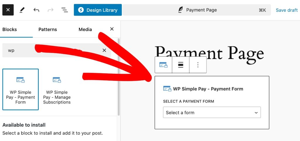 To embed the form, navigate to the post or page where you want to publish it. Next, add the WP Simple Pay block by clicking on the + icon and selecting the WP Simple Pay block. Then choose the donation form you just created. And then, publish or update the form.
