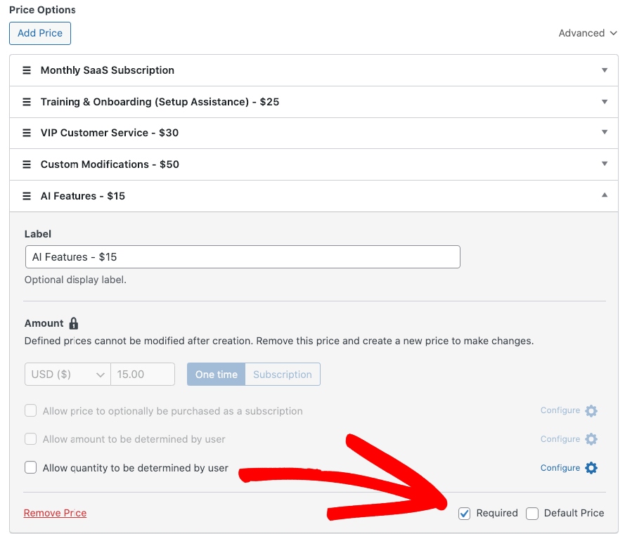 You can simply enter the price of the add-on, name it, and make it required or optional on your payment forms.