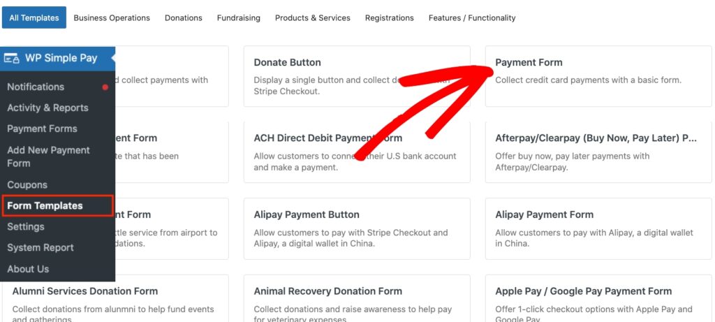 To get started, go to WP Simple Pay » Form Templates in your WordPress dashboard and click on the Payment Form template.