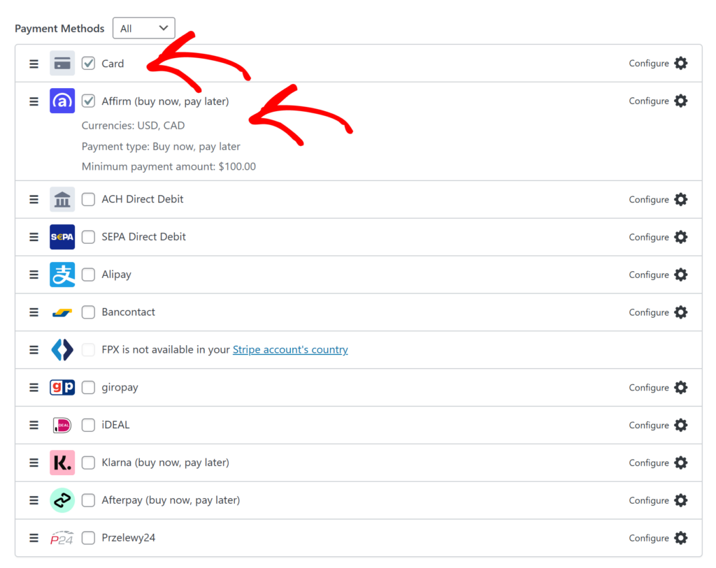 From the dropdown menu containing the payment method options, be sure to select All. You’ll see the full list of available payment methods. For the sake of this tutorial, choose Affirm (buy now, pay later) and Card. You’ll notice that there is a $100 minimum requirement for Affirm payments.