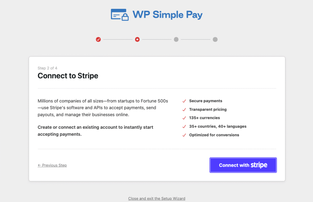 After activating WP Simple Pay, you’ll need to connect it to your Stripe account. The setup wizard should automatically appear, where you can easily connect your Stripe account or even create a new one.