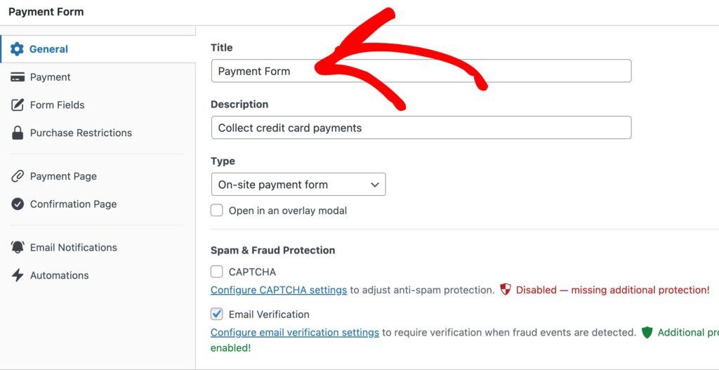 Enter the title and description of your form and choose the On-site payment form option to ensure it is available directly on your website.