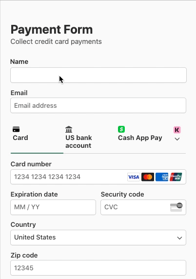 Simply select the payment methods you want to offer customers from the list. For this particular payment form, we’ve selected Card, ACH Direct Debit, Cash App, and Klarna.