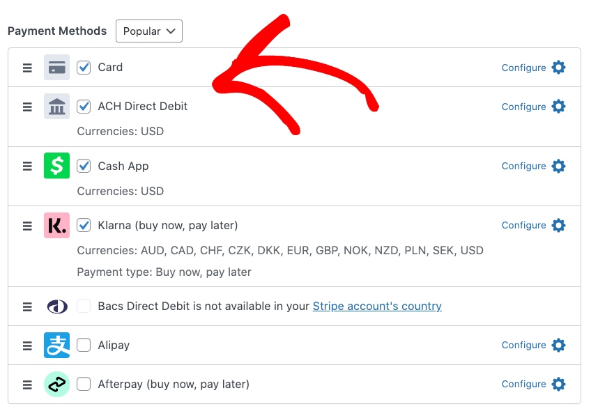 On the same page, you can also enable multiple payment methods that you want to offer via this particular form.