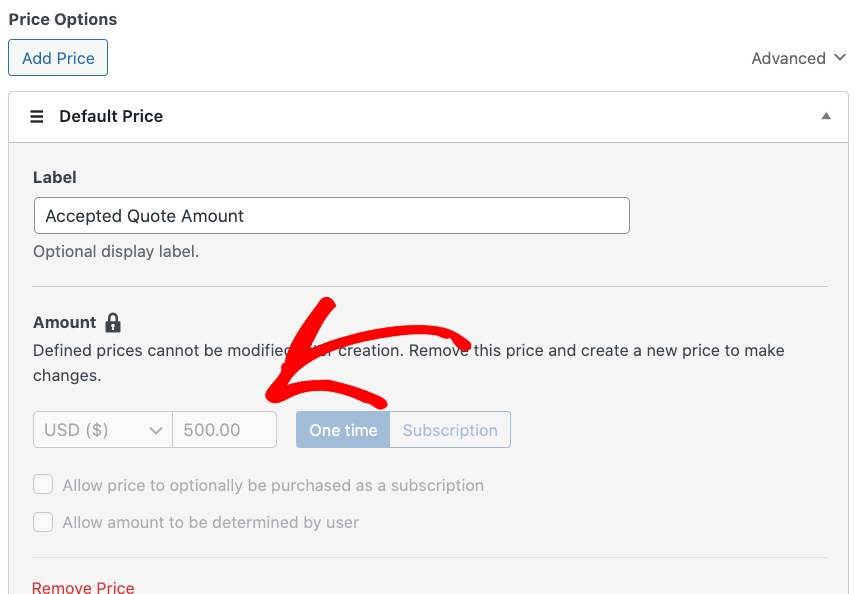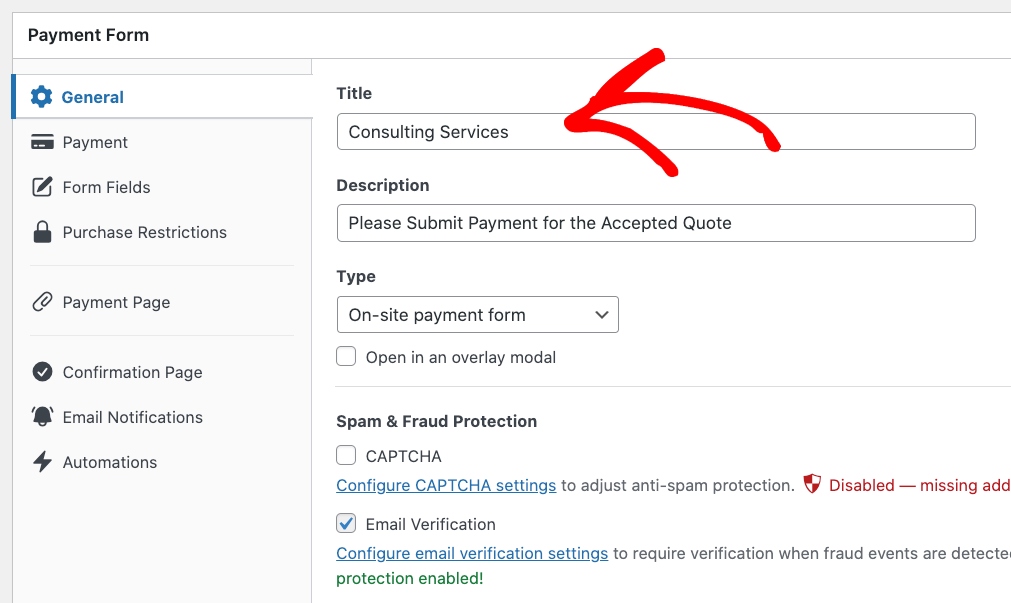 Be sure to leave On-site payment form selected for the form Type. Then, click on the Payment tab and enter the accepted price amount.