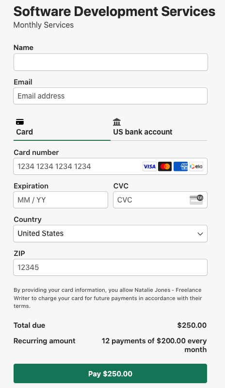 For the purpose of this tutorial, we’ll create a subscription payment form with a one-time activation fee. When we’re finished, it should look like the one below.