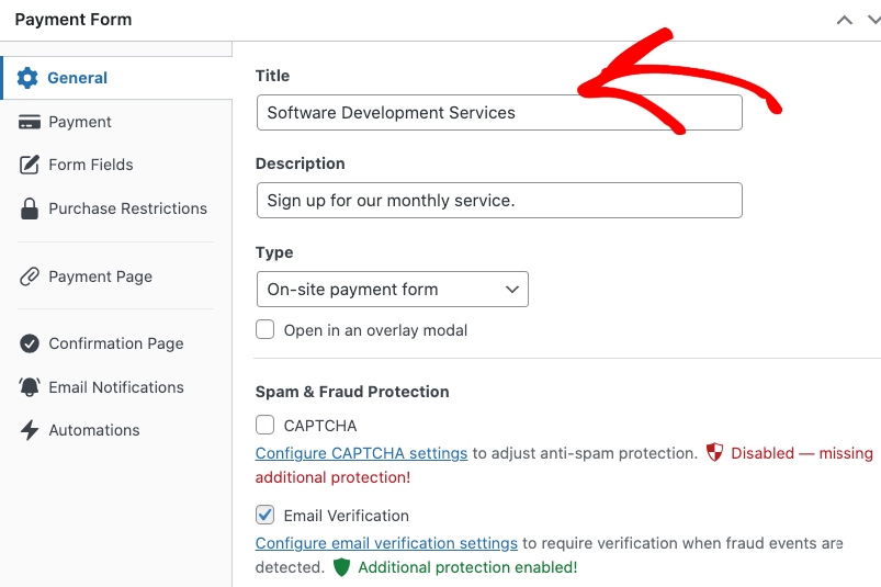 In the General tab, enter the title and description of your form and choose On-site payment form as the Type.