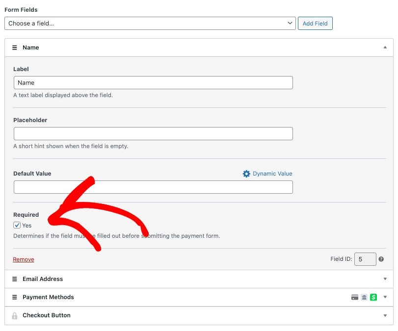 Next, in the Form Fields tab, you can edit, add, and remove custom form fields. For this payment form, add Name from the dropdown menu and check the box next to Required.