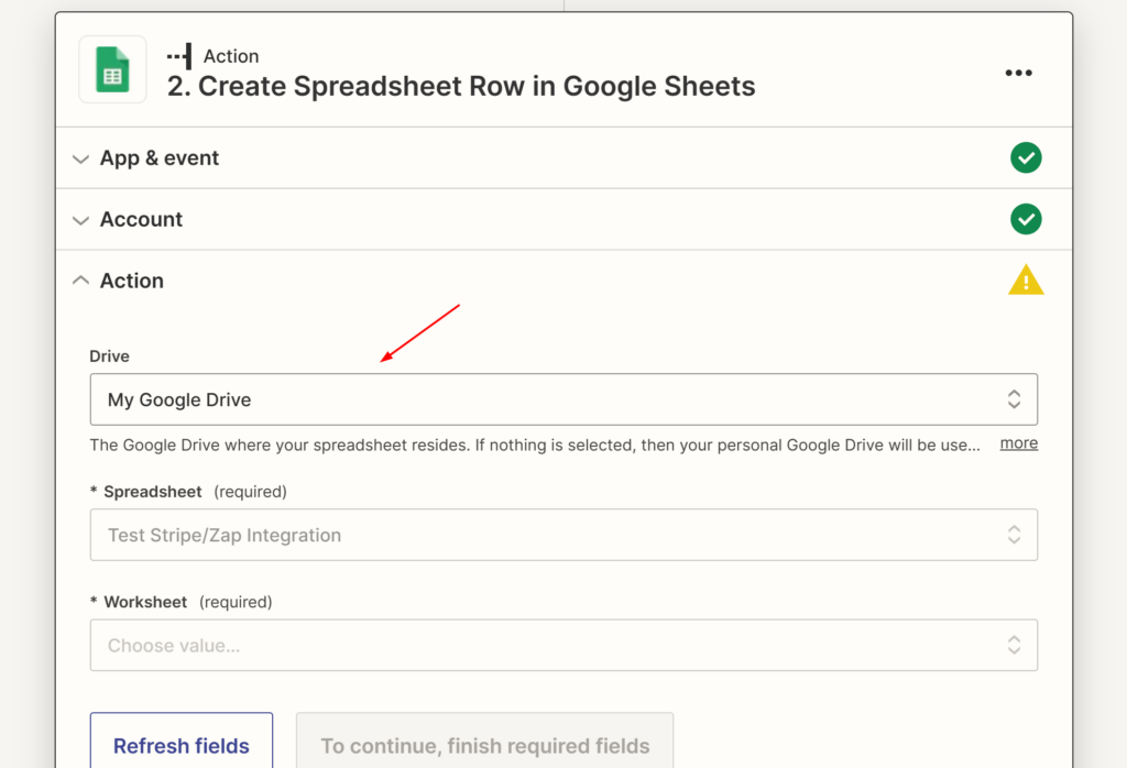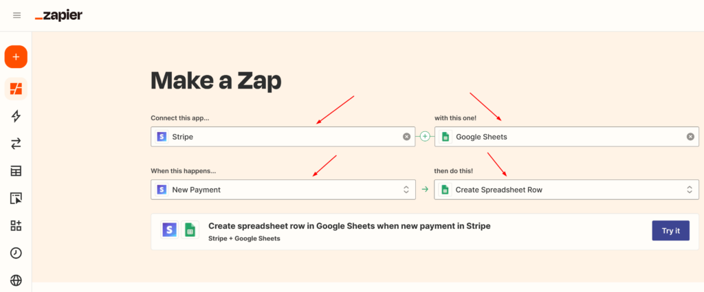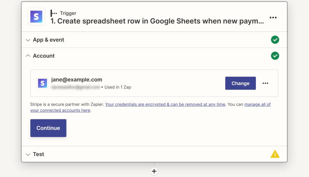 While there are tons of different combinations of apps, triggers, and actions you can implement, for this tutorial, we’re going to choose Stripe + Google Sheets for the apps and New Payment → Create Spreadsheet Row for the Action.