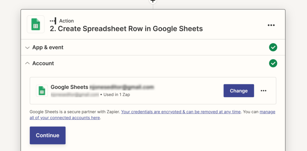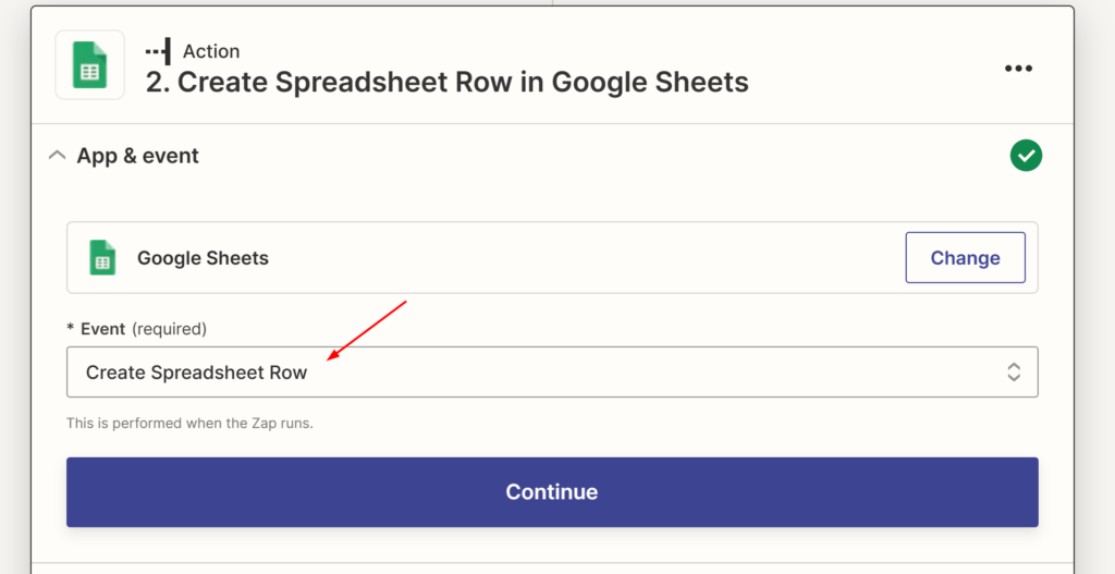 Next, you’ll be prompted to add information related to the Action you want to be triggered. Be sure to choose Create Spreadsheet Row for your event.