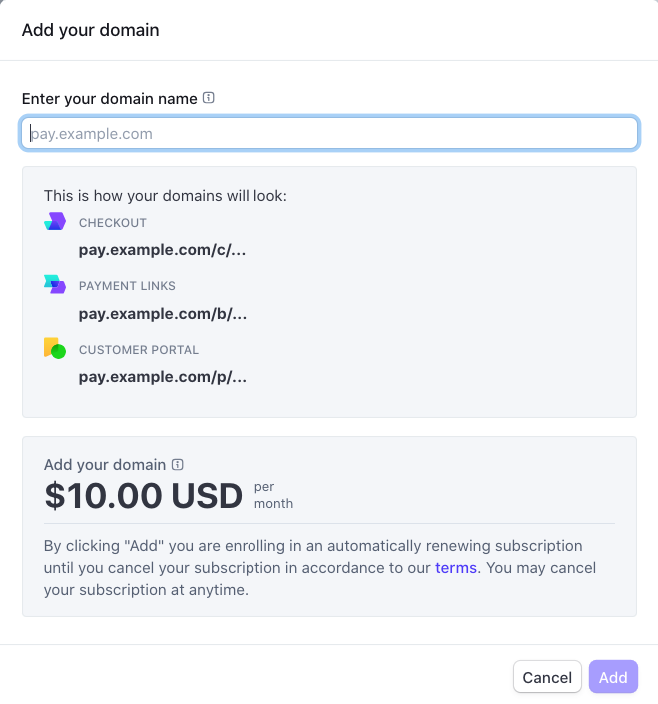 Using your own domain on a Stripe Checkout page rather than directing your customers to a generic Stripe-hosted checkout page provides a consistent buying experience, improves brand recognition, and strengthens your credibility.