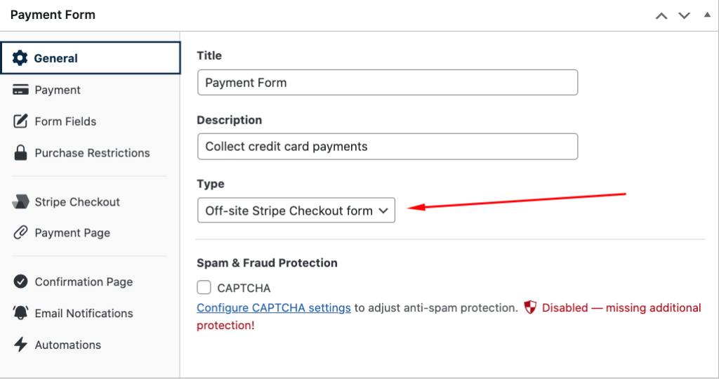 When creating a payment form, ensure you use Off-site as your form Type to display forms on the Stripe Checkout page with your custom domain. You can easily make this selection from the General tab within the plugin’s drag-and-drop payment form builder.