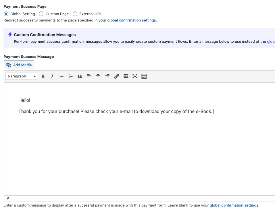 Go ahead and click on the Confirmation Page option on the left-hand side. Here, you can enter a custom payment confirmation message that your customers will see after a successful payment.