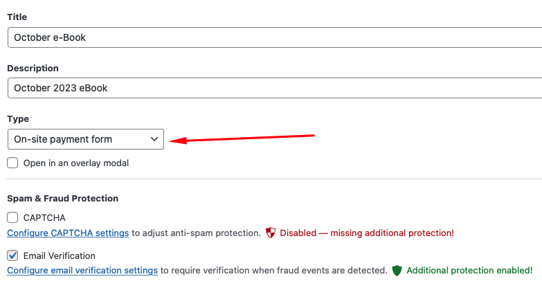 Next, you’ll be prompted to enter the title and description to your payment form. Be sure to also select On-site payment form to ensure that your customers complete their purchases directly on your site.